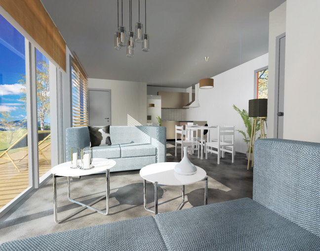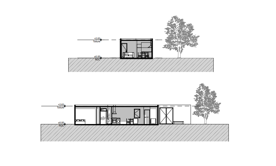 Cette maison originale de 50,79 m² reprend la base de l’architecture des maisons containers. Maison plain pied, elle peut accueillir un couple ou famille en devenir car facilement agrandissable. Cette maison est faite de deux containers accolés et comprend un espace de vie ouvert de 26,92 m². Les deux chambres sont accessibles de part et d’autre de la pièce de vie et possède leur propre salle de bain.Très lumineuse grâce à ses grandes baies vitrées, l’intérieur bénéficie d’une superbe lumière naturelle et permet d’avoir une vue directe sur le jardin et la terrasse de 37 m². Vous pouvez télécharger les plans de cette maison dés à présent.