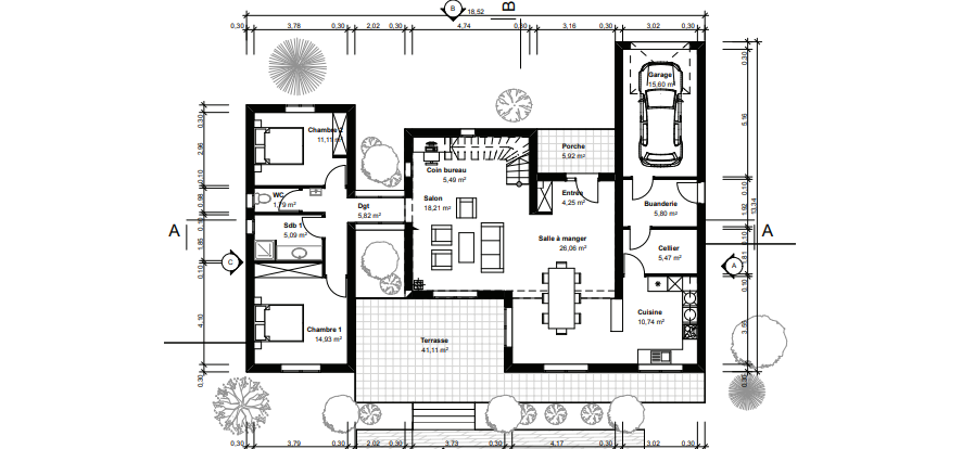 Le plan de cette maison contemporaine d’une surface habitable de 156,63 m² est bien pensé et permet d’avoir une maison familiale.