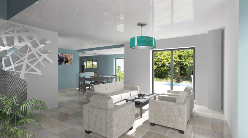 Cette villa, sur deux niveaux, est très lumineuse grâce à ses nombreuses baies vitrées. Elles vous permettront de bénéficier d’une belle lumière naturelle et d’avoir une vue directe sur la terrasse de 41,11 m² et la piscine.